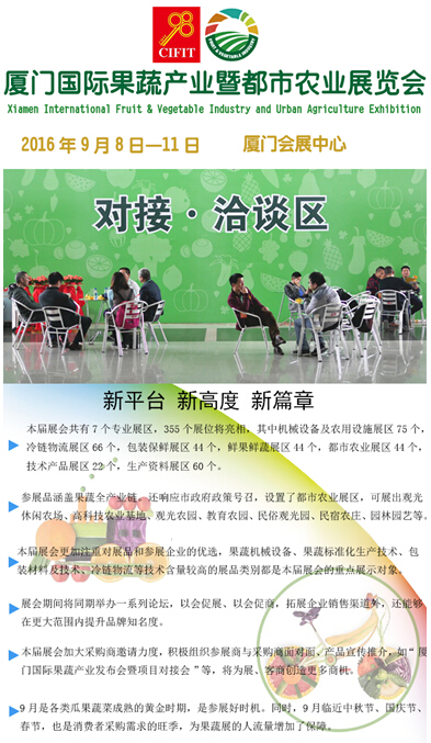 今年,廈門國際果蔬產業暨都市農業博覽會將攜手2016中國國際投資貿易洽談會,共享其“展(展示)、貿(貿易)、投(投資)、洽(洽談)”的優質資源。