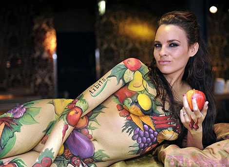 日前,美麗動人的女模特朱麗葉·瓊斯用人體彩繪的方式,把自己的身上畫滿蔬菜和水果,在英國倫敦一家素食餐館前進(jìn)行展示。