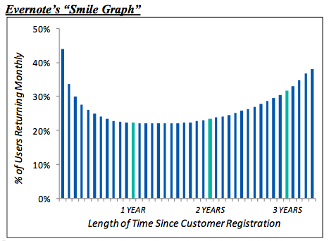 Evernote的“微笑曲線”:長遠來看,用的越久黏性越高