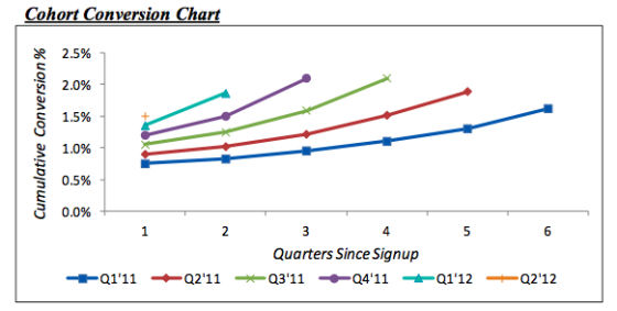 用戶群數(shù)據(jù)幫助企業(yè)了解在產(chǎn)品開發(fā)和定價過程中極具價值的信息。對免費增值模式用戶群最常見的一項分析是跟蹤長期的累積轉(zhuǎn)化率。在理想狀況下,免費增值公司的累積轉(zhuǎn)化率應(yīng)當隨時間上升,而每一個群體的累積轉(zhuǎn)化率指標都應(yīng)當上升。
