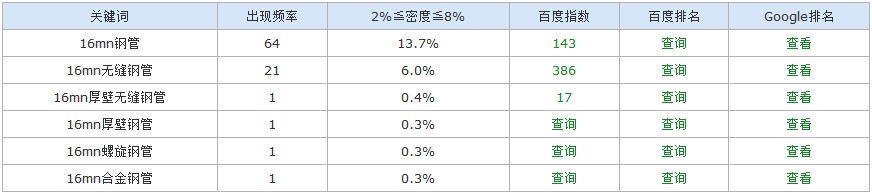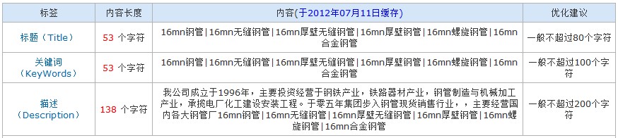 從上圖中可以看出,網站的關鍵詞全部都是從“16mn鋼管”延伸出來的,本意是想從提高“16mn鋼管”關鍵詞排名,最后的效果確往往是適得其反,偷雞不成蝕把米。關鍵詞的添加需要自然,切勿刻意堆積。其實我們無需刻意堆積,百度本身是擁有分詞技術的,即使關鍵詞只出現一次,百度也會通過分詞技術得到后面的關鍵詞。谷旭旭之前寫的的一篇文章“詳談網站標題、關鍵詞、描述的寫法”中詳細介紹了網站三個標簽的寫法,有興趣的朋友可以去看看。