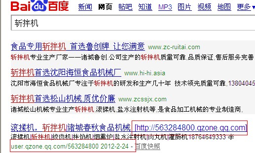 今天看到一個還是比較熱的關鍵詞百度排名第一的竟然是個QQ空間,當時也是很是驚訝的,但是看了一下QQ空間的robots文件明白也是屬于正常現象了,如下圖百度“斬拌機”除去競價排名第一的就是一個用QQ空間做的關鍵詞。
